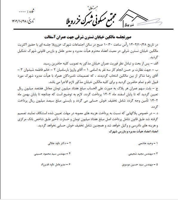 - صورتجلسه مربوط به عمران مالکین پلاکهای خیابان میخک غربی
