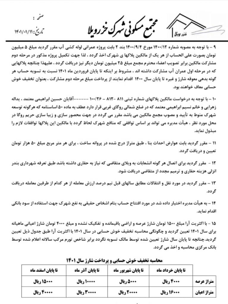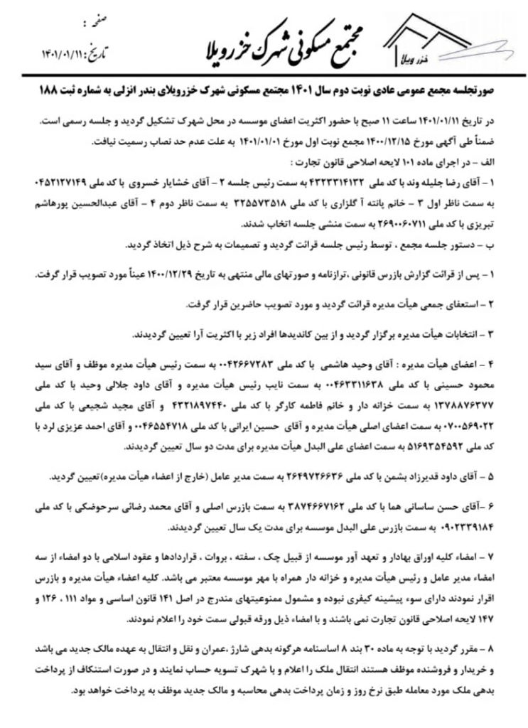 • صورتجلسه مجمع عمومی عادی نوبت دوم سال ۱۴۰۱ مجتمع مسکونی شهرک خزرویلا